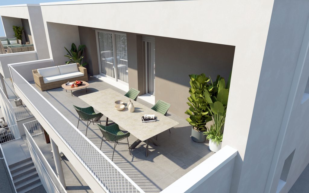 L’edificio ospita quattro appartamenti tricamere, due al piano terra con giardino privato e due al piano primo con ampie terrazze vivibili, ideali per momenti di relax all’aperto.